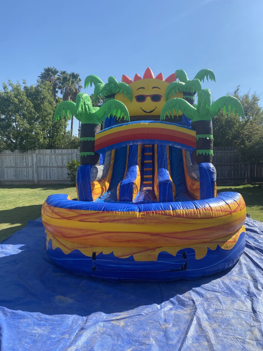 Don't miss the chance to take your celebration to the next level with the Waterslides 16 ft Dual Lane Tropical Waterslide in Madera, CA, Madera Ranchos, CA, Fresno, CA, Clovis, CA. Whether you're planning a birthday bash, school event, or neighborhood get-together, this waterslide guarantees non-stop fun and unforgettable memories!